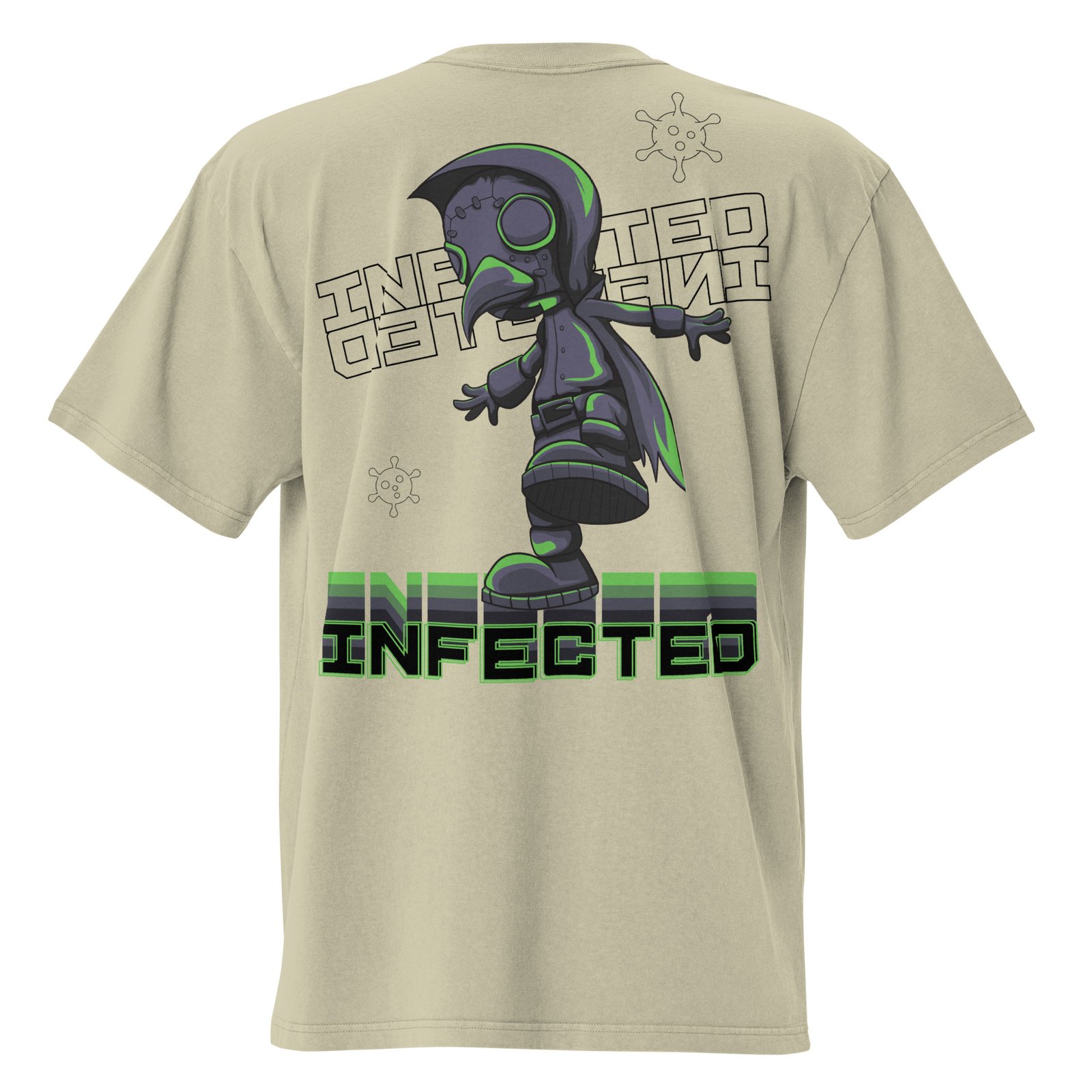 An oversized t-shirt combining the dark history of the Plague Doctor with a striking modern design in bold shades of neon green and gray.