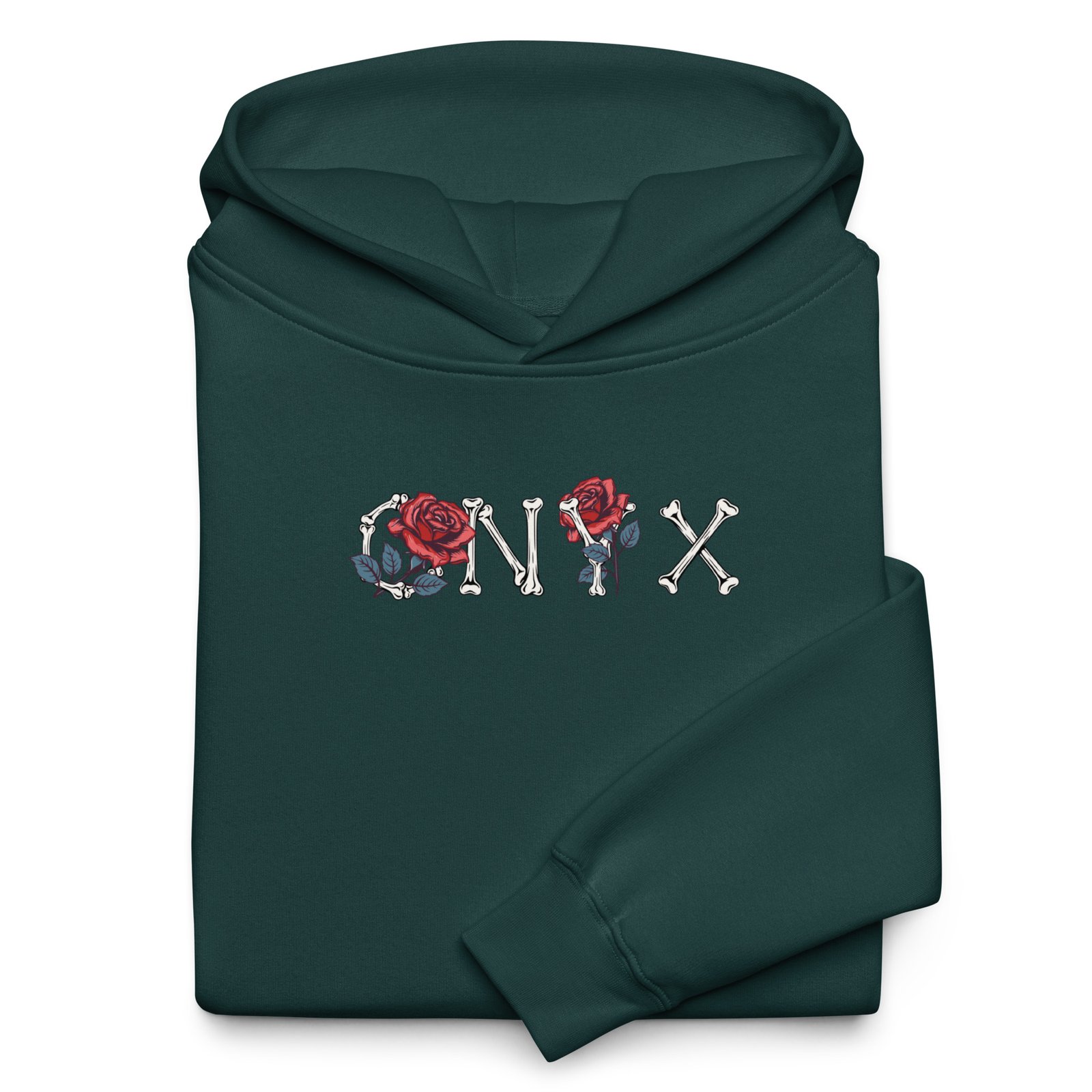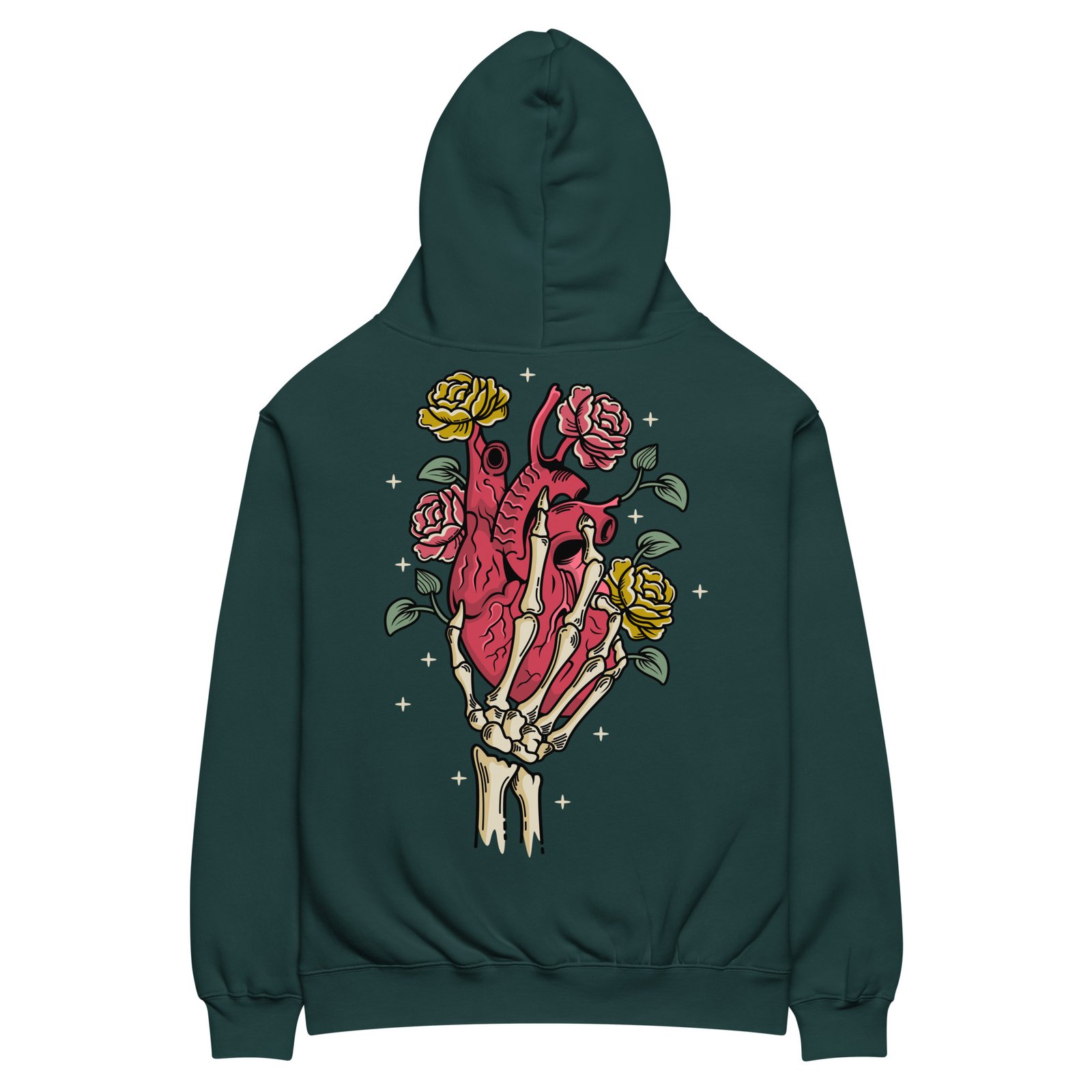 The design features a red anatomical heart surrounded by flowers and a skeleton hand holding it. The skeleton hand conveys a sense of strength and contrast, while the heart, despite being physical and realistic, emanates life and energy. The flowers symbolize life and beauty, but in combination with the skeleton hand and heart, they create a thorned embrace, representing the connection between life and death, beauty and decay.